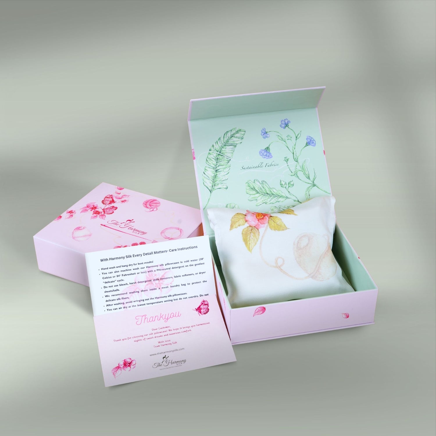 Beyond the silk pouch, your pillowcase is enclosed in another layer of luxury with our eco-friendly boxed packaging. This additional casing not only enhances the unboxing experience but also reflects our dedication to sustainability and the environment. The entire packaging is designed to be as beautiful as it is functional, making it perfect for gifting or personal indulgence.