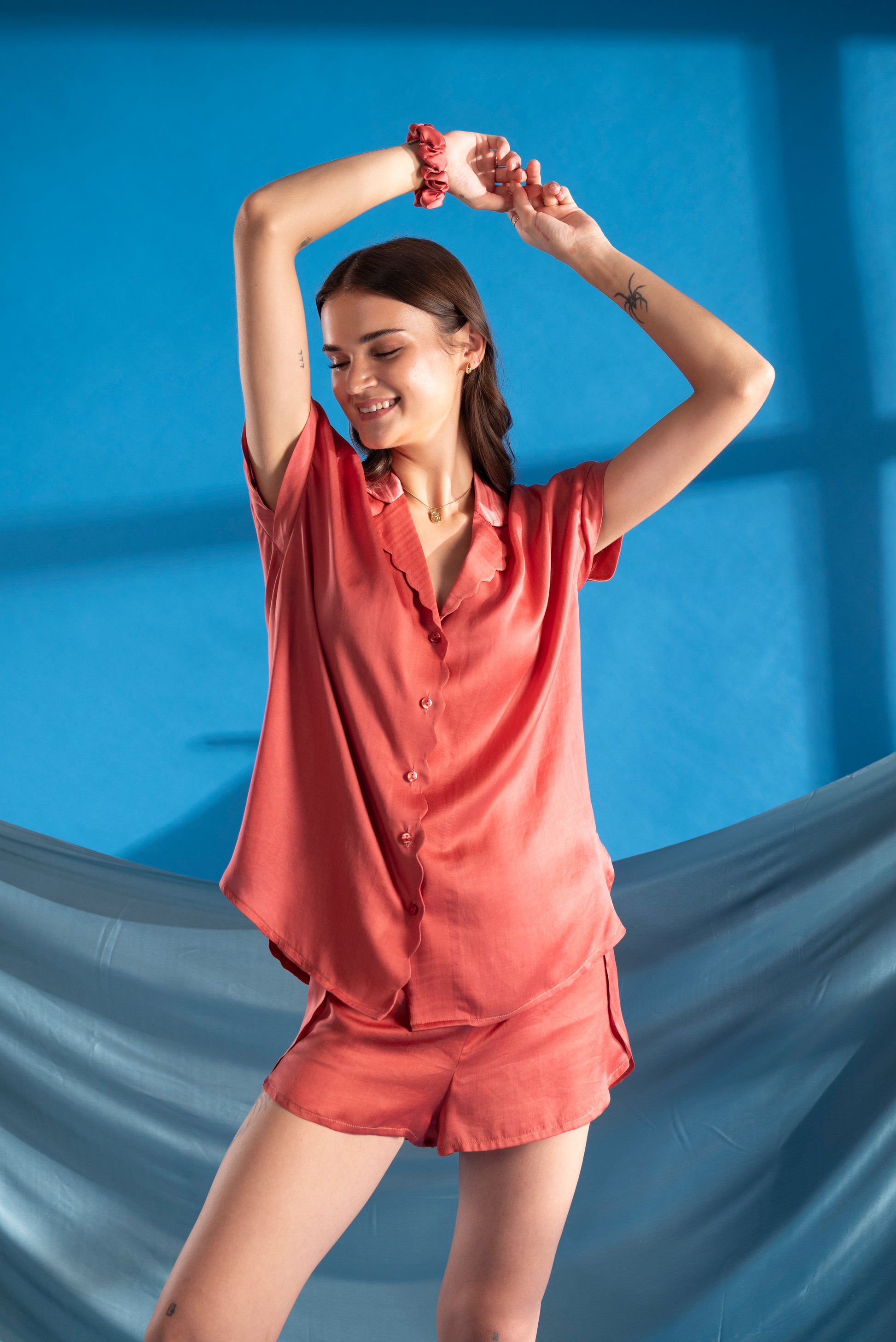 Matching shorts with scalloped edges mirror the top’s playful finish, completed with a soft stretchable waistband, pockets, and tone-on-tone buttons. Every detail is intentional, and every seam is designed to disappear in comfort.